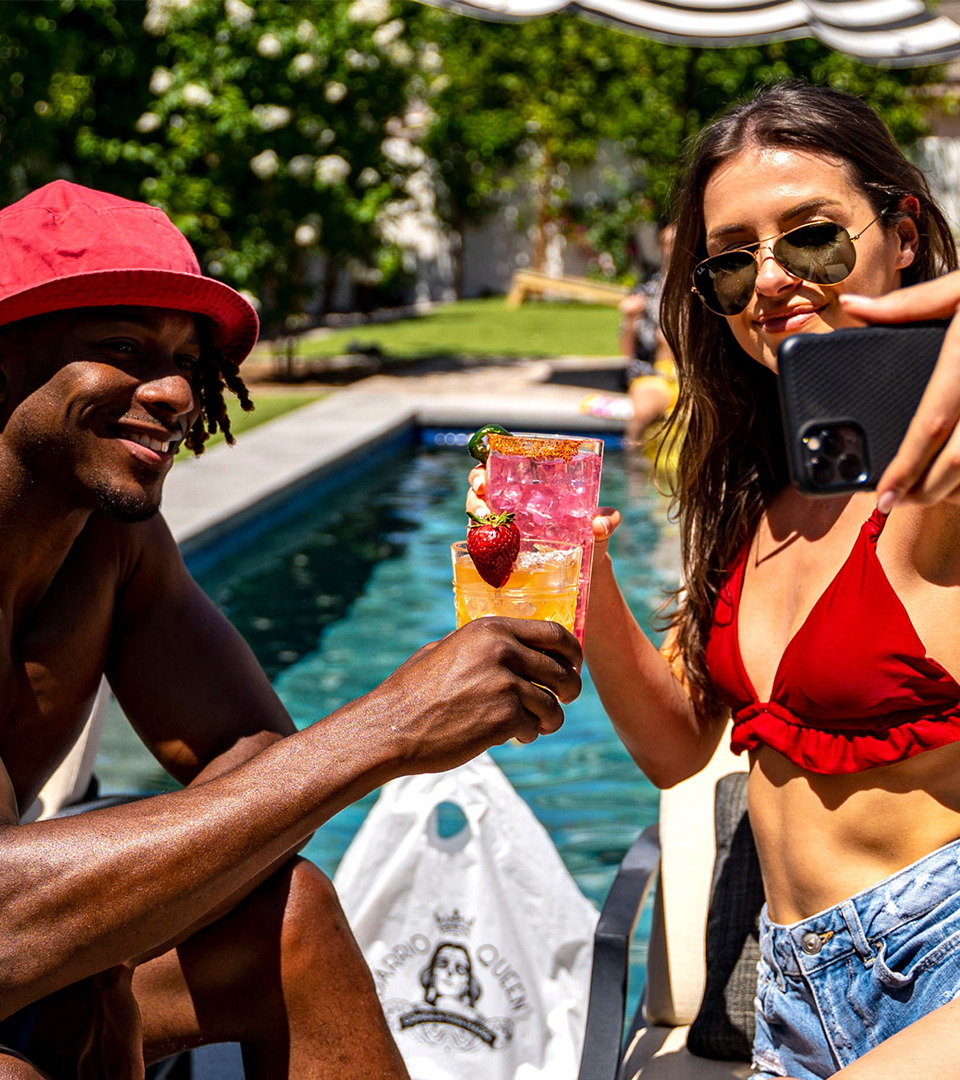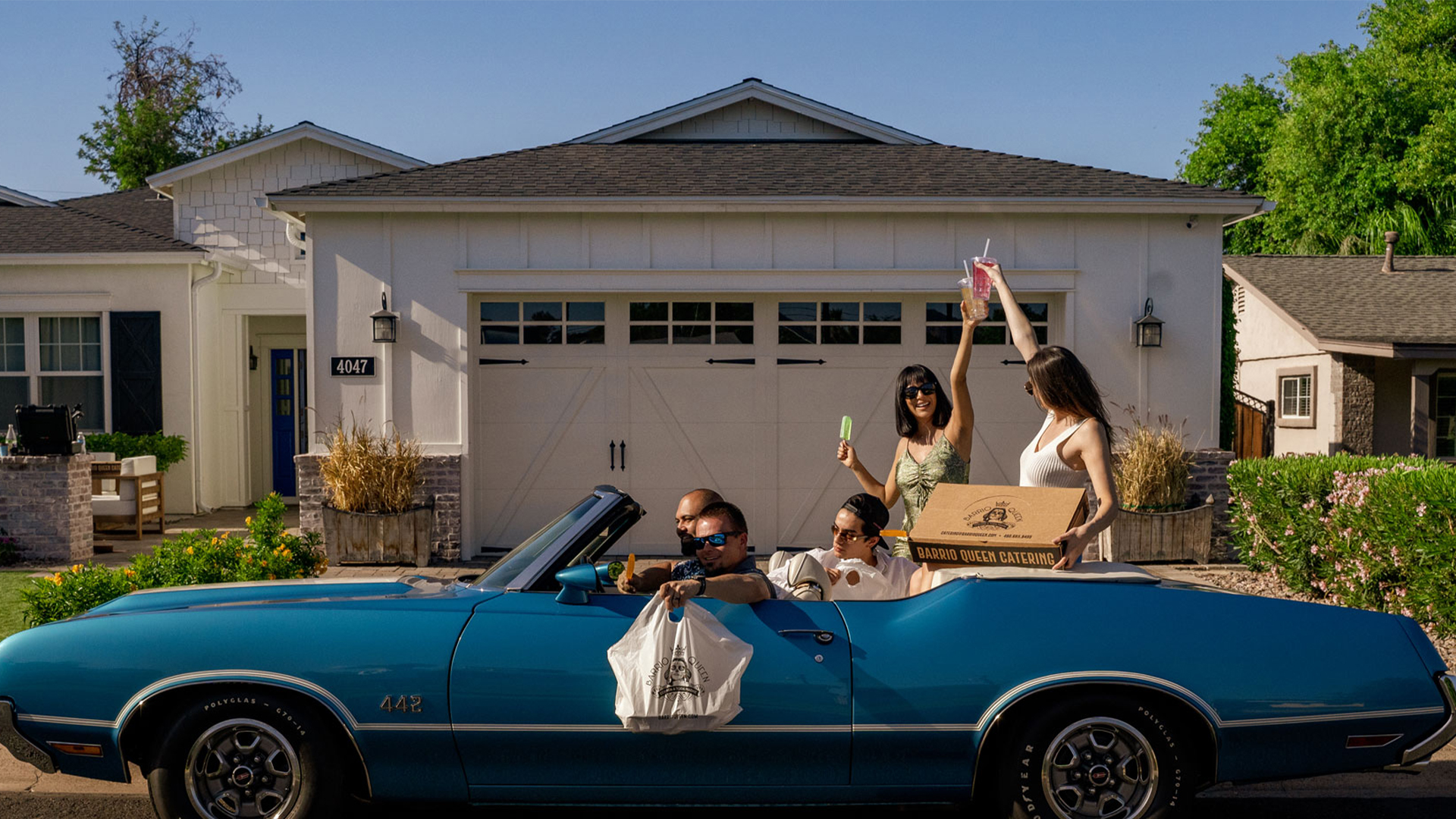 The concept moved the camera off the food and onto the people eating it. A group of friends pick up catering from Barrio Queen, pile into a '70s convertible, and end up at a backyard pool — food out, drinks in hand, the good times rolling.