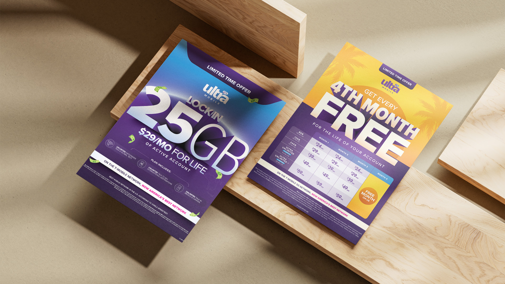 Ultra Mobile lives or dies on the retail shelf. It's sold inside cell phone stores where every carrier, every plan, and every sticker is fighting for the same two seconds of attention. The brief was a pair of seasonal promos for Tax Season and Summer time. Each with a short window to drive new sales. Both had to be immediately recognizable as Ultra, but fresh enough that retailers and customers wouldn't mistake them for the last flash sale.