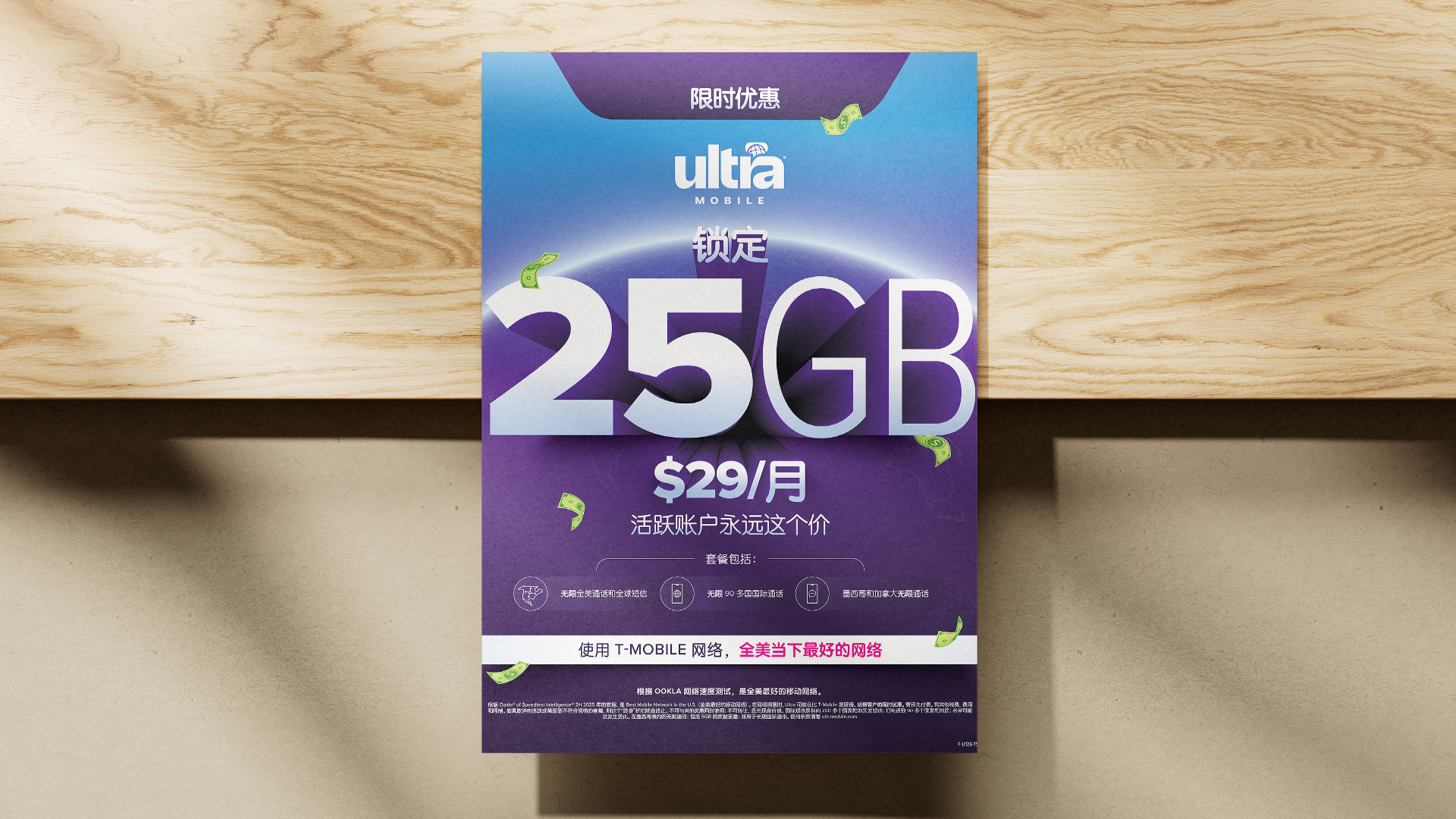 Tax Season leaned into the insight that Ultra's target customer wasn't chasing the lowest price, they wanted the best use of the extra money in their pocket. I built the visual around falling cash and dimensional 3D elements that made the offer the hero. Ultra's primary purple carried the brand, a silver finish on the offer figures added a premium note, and UV spot coating on the 3D elements gave the print pieces physical presence on a retail shelf — something to catch the light, not just the eye.
