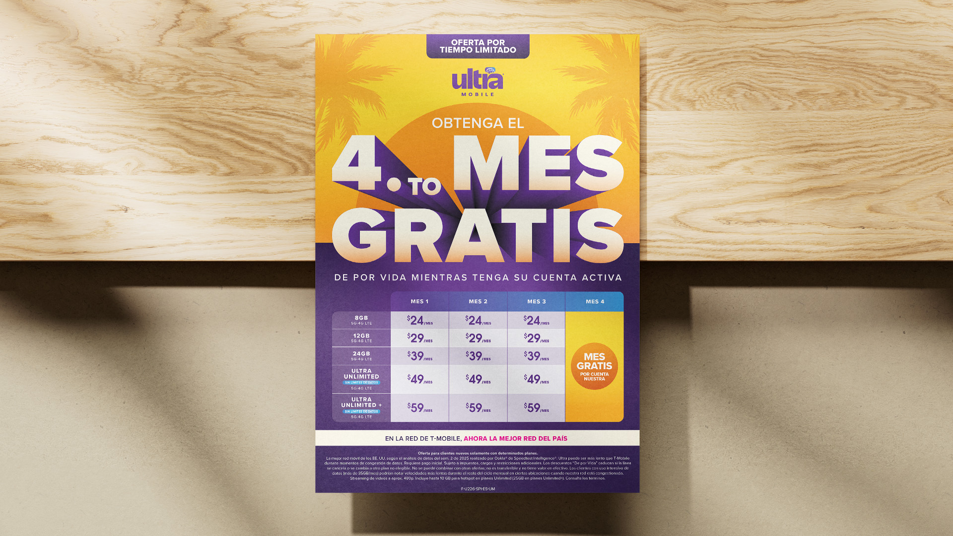 The Summer promo turned the palette the other direction. The design pulled Ultra's secondary yellow forward, staging the offer against a sunset over a purple horizon. Palm trees and a low sun carried the seasonal cue without overselling it.